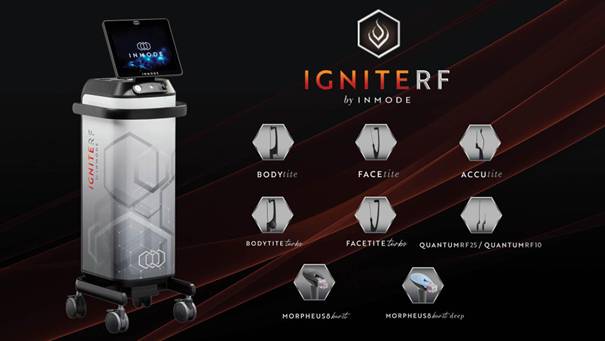 IGNITERF jest mało inwazyjnym urządzeniem przeznaczonym do zabiegów medycyny estetycznej, chirurgii plastycznej. Użytkownik z zestawu 9 aplikatorów ma możliwość wyboru wyposażenia indywidualnie dobranego do swoich potrzeb (QuantumRF, Morpheus8 Burst, Morpheus8 Burst Deep, FaceTite, BodyTite, AcuTite, FaceTite Turbo i BodyTite Turbo).