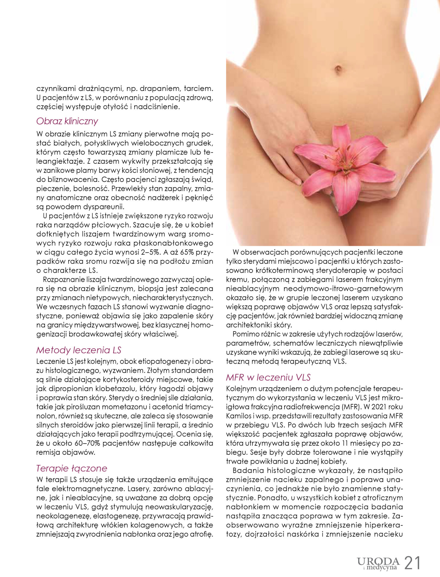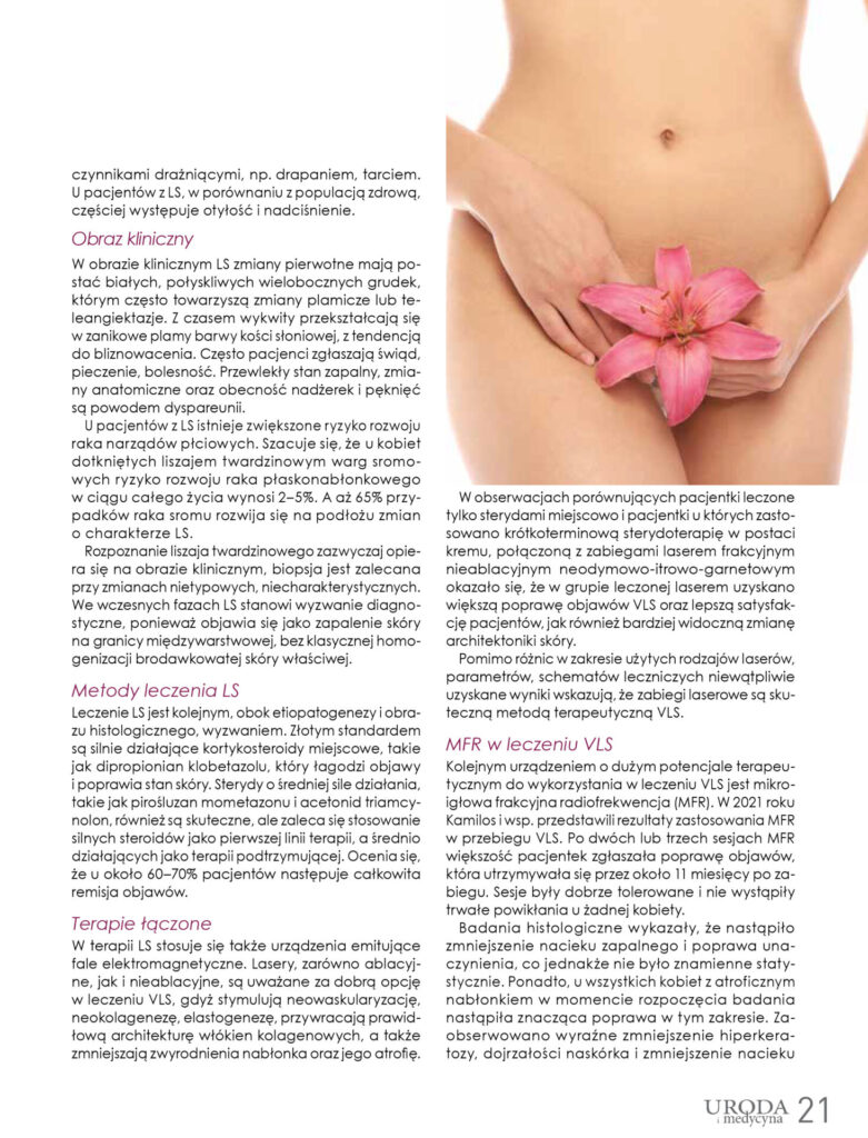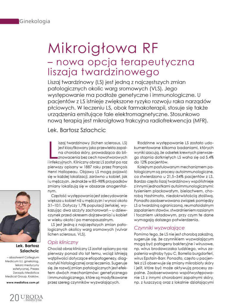 Liszaj twardzinowy (LS) jest jedną z najczęstszych zmian patologicznych okolic warg sromowych (VLS). Jego występowanie ma podłoże genetyczne i immunologiczne. U pacjentów z LS istnieje zwiększone ryzyko rozwoju raka narządów płciowych. W leczeniu LS, obok farmakoterapii, stosuje się także urządzenia emitujące fale elektromagnetyczne. Stosunkowo nową terapią jest mikroigłowa frakcyjna radiofrekwencja (MFR).