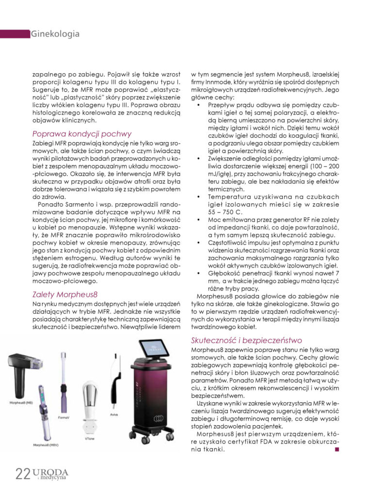 Morpheus8 zapewnia poprawę stanu nie tylko warg sromowych, ale także ścian pochwy. Cechy głowic zabiegowych zapewniają kontrolę głębokości penetracji skóry i błon śluzowych oraz powtarzalność parametrów. Ponadto MFR jest metodą łatwą w użyciu, z krótkim okresem rekonwalescencji i wysokim bezpieczeństwem. Uzyskane wyniki w zakresie wykorzystania MFR w leczeniu liszaja twardzinowego sugerują efektywność zabiegu i długoterminową remisję, co daje wysoki stopień zadowolenia pacjentek. Morphesus8 jest pierwszym urządzeniem, które uzyskało certyfikat FDA w zakresie obkurczania tkanki.