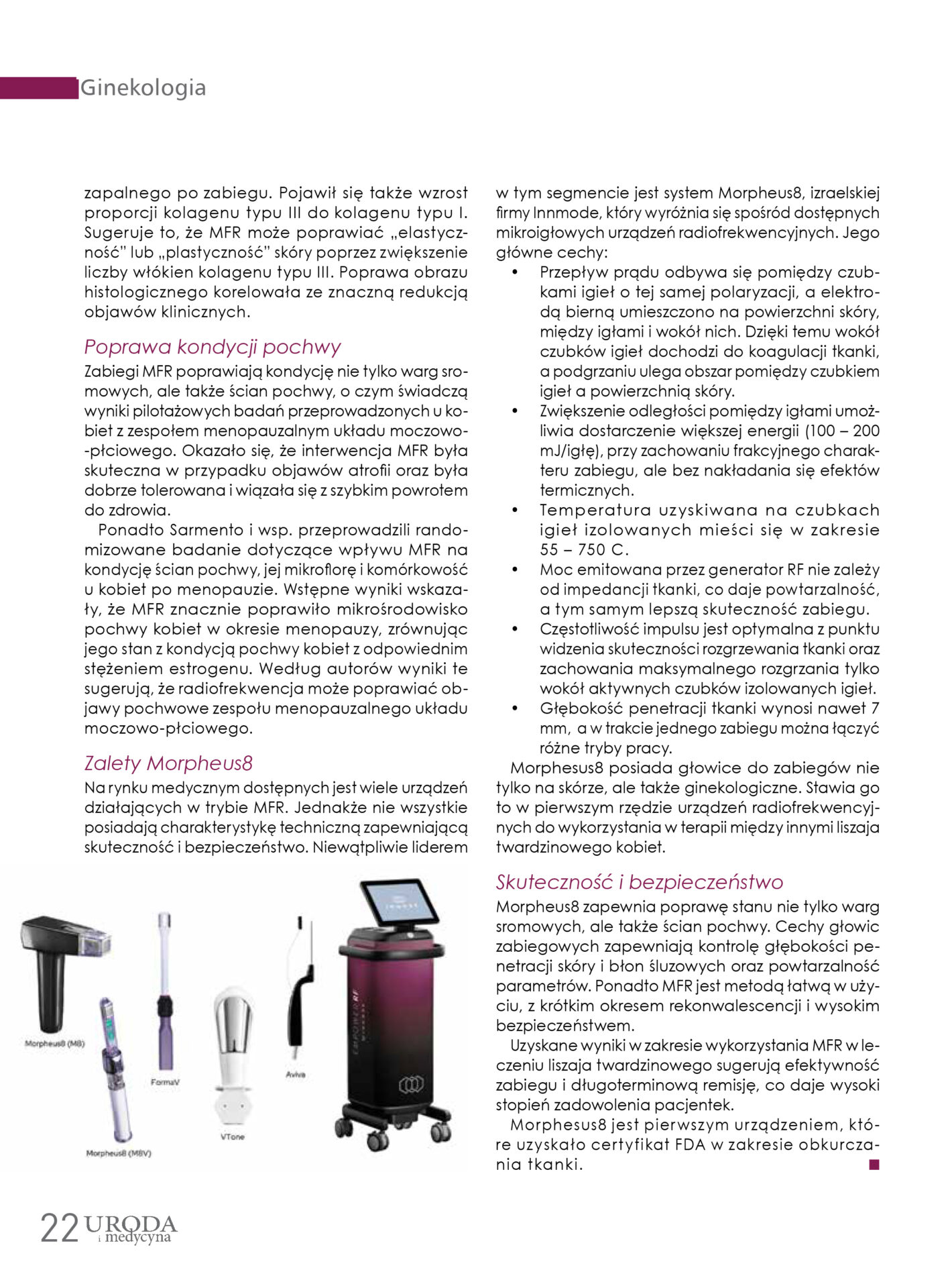 Na rynku medycznym dostępnych jest wiele urządzeń działających w trybie MFR. Jednakże nie wszystkie posiadają charakterystykę techniczną zapewniającą skuteczność i bezpieczeństwo. Niewątpliwie liderem w tym segmencie jest system Morpheus8, izraelskiej firmy Innmode, który wyróżnia się spośród dostępnych mikroigłowych urządzeń radiofrekwencyjnych. Jego główne cechy: