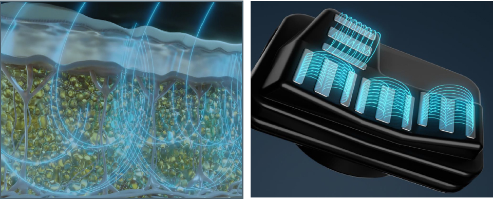 Oscylacja koncentryczna emituje okrężny wzór energii RF, zapewniając lepsze, równomierne rozprowadzanie ciepła i zwiększony przepływ krwi do tkanek. Energia RF jest dostarczana sekwencyjnie do każdego aplikatora, zapewniając równomierne rozprowadzenie energii w obszarze zabiegowym.