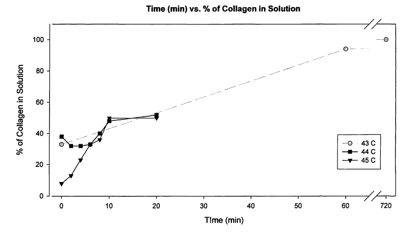 = szybkość reakcji ogrzewania kolagenu jest zależna zarówno od czasu jak i temperatury grzania. Przykładowo w temperaturze 85 °C, czas ∼ 1 ms wystarczy do wywołania zmian strukturalnych. Dla temperatury 43 °C, czas wynosi od ~ 90 s do 5 min.