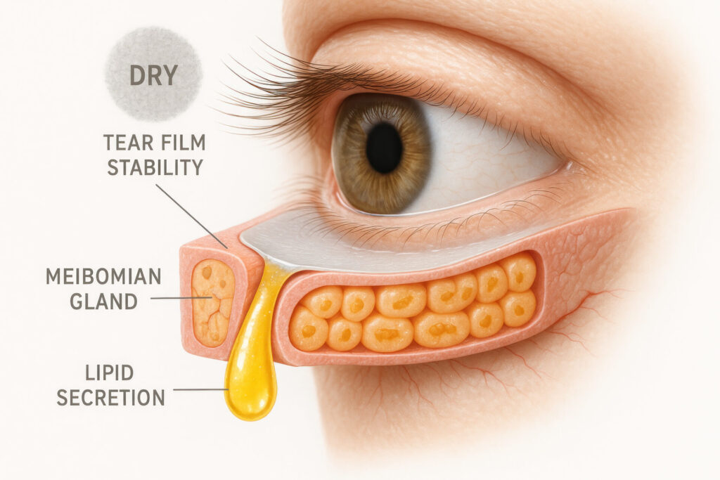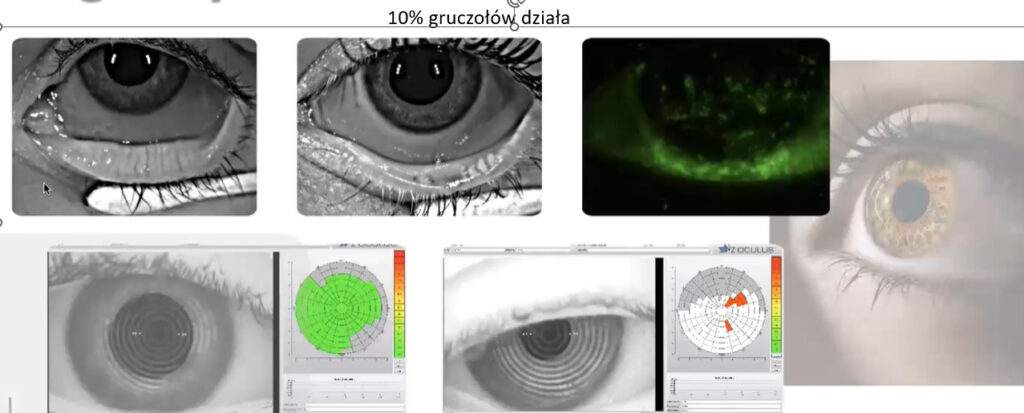 Zabieg RF jest korzystny w przypadku przewlekłej dysfunkcją gruczołów Meiboma. Wykazano, że radiofrekwencja stymuluje gruczoły łojowe powiek, co poprawia jakość filmu łzowego i łagodzi objawy zespołu suchego oka. Ciepło dodatkowo stymuluje produkcję kolagenu, dostarczając białe krwinki i komórki macierzyste do skóry wokół oczu, jednocześnie zmniejszając stan zapalny.