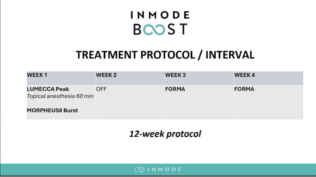 Protokół zabieowy jest oparty na technice Inmode Boost. Technika Inmode Boost łączy trzy sprawdzone technologie: IPL przeznaczone m.in. do redukcji zmian pigmentacyjnyc i naczyniowych, nieinwazyjny RF stymulujący produkcję kolagenu i mikroigłowy RF redukujący głębsze zmarszczki i blizny. Zabieg wykonuje się za pomocą trzech różnych aplikatorów Lumecca , Morpheus8 oraz Forma, których parametry dobierane są indywidualnie do zmian występujących na skórze twarzy.